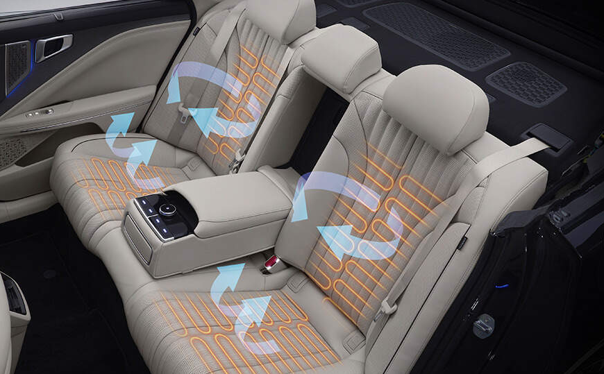여기에 수평 라인을 강조한 간접 조명이 세련되면서도 고급스러운 실내 분위기를 연출하는데요, 요즘 신차에서 필수적인 앰비언트 라이트가 적용된 더 뉴 K8은 중형 세단보다 넓은 실내 공간을 자랑하며, 1열과 2열 모두 넉넉한 착좌감과 편안함을 제공합니다. 특히, 뒷좌석에는 열선과 통풍 기능이 제공되며, 3존 공조 시스템이 적용되어 뒷좌석 승객도 온도 조절이 가능하여 패밀리 세단으로써의 활용성이 뛰어납니다. 추가로, 지난해 현대차 싼타페에서 처음 도입된 양문형 콘솔 암레스트에는 열선과 UV-C 살균 기능이 포함되어 있으며, 센터 콘솔 앞쪽에는 듀얼 스마트폰 무선 충전 시스템이 탑재되어 고급스러움과 함께 첨단 기술감을 더하고 있습니다.