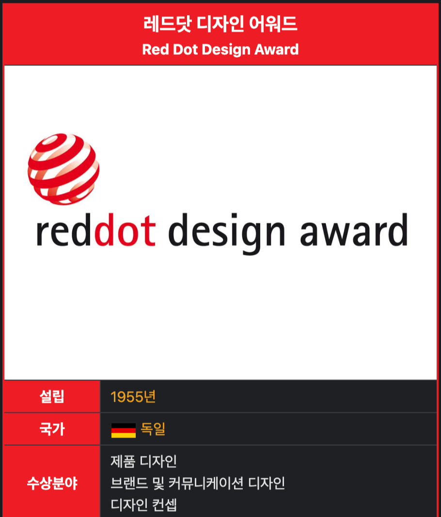 - 레드닷 디자인 어워드: 프로덕트 디자인 (Red Dot: Product Design): 다양한 제품 디자인에 수여됩니다.