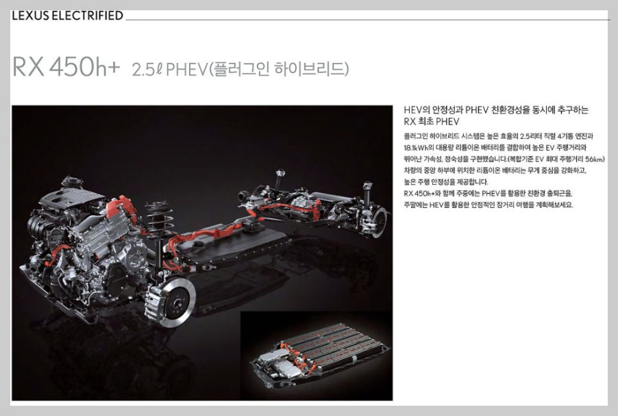 렉서스 RX 450h+는 2.5리터 직렬 4기통 자연흡기 엔진과 18.1 kWh의 리튬이온 배터리를 탑재하여, 시스템 총 출력 309마력을 발휘합니다. 1회 충전으로 전기 모드로만 최대 약 56km(복합 기준)까지 주행할 수 있으며, 복합연비는 14.0km/ℓ입니다.