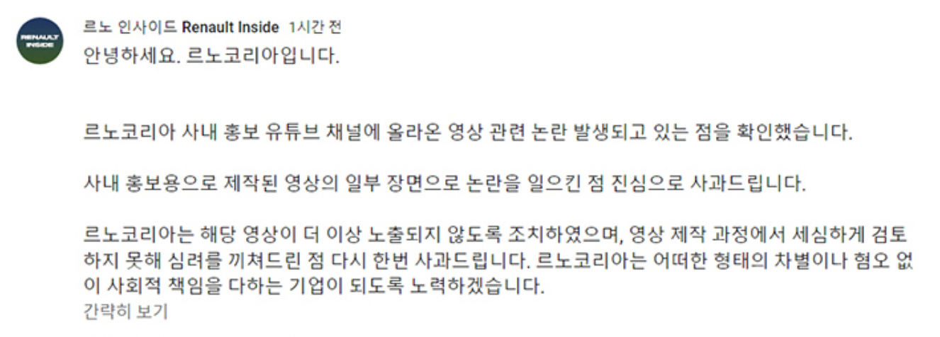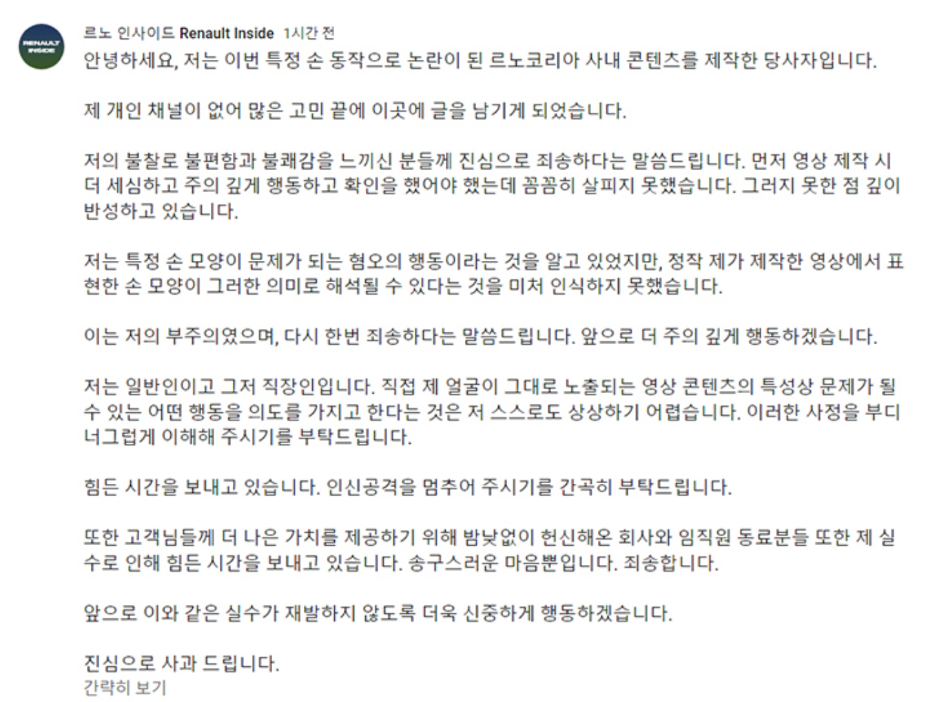 이에 대해 당사자는 르노 인사이드 공식 계정에 사과문을 올리기도 했는데요, 개인 계정이 아닌 공식 채널을 통해 사과한 것은 이례적인 일이기도 하면서 사안의 심각성을 보여주는 듯하는데요, 사과문 내용에는 혐오의 행동이라는 것을 알고 있었음에도 불구하고, 그 동작이 영상에서 혐오의 의미로 해석될 수 있다는 점을 인식하지 못했다고 합니다. 모순된 주장이죠? 사과문을 간략히 요약하자면, "잘못했다. 그런데 나 힘들다, 이제 내버려 둬"라는 식의 논리로 비치는 건 어쩔 수 없을 것 같네요.
