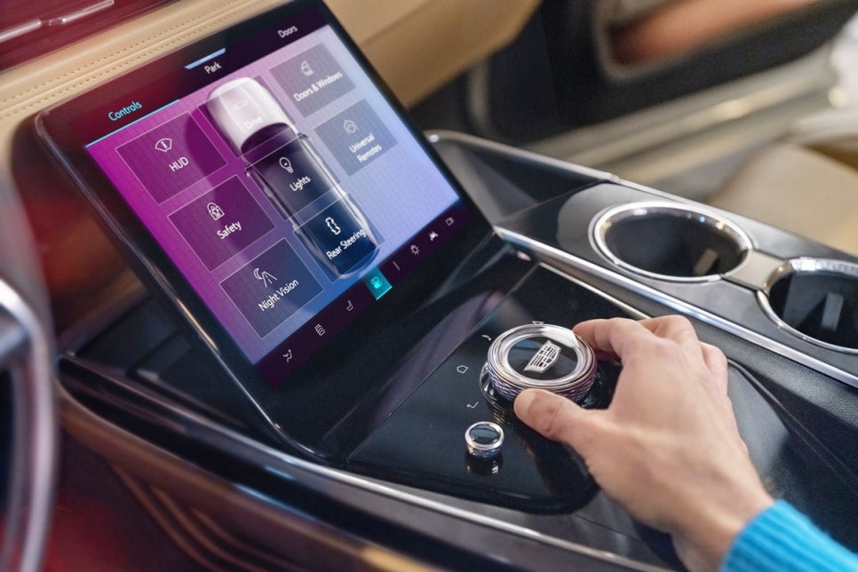 센터패시아 하단에는 공조 장치를 조작할 수 있는 별도의 컨트롤 패널이 자리잡고 있습니다. 시트의 열선, 통풍, 마사지 기능은 도어 트림에 위치한 스위치를 통해 조절할 수 있으며, 스티어링 휠은 간결하면서도 고급스러운 2 스포크 디자인으로, 볼륨 조절과 크루즈 컨트롤 속도 조절 외에는 물리 버튼을 최소화했습니다. 변속 조작은 GM의 최신 차량에서처럼 스티어링 컬럼에 장착된 레버를 사용하여 조작합니다.