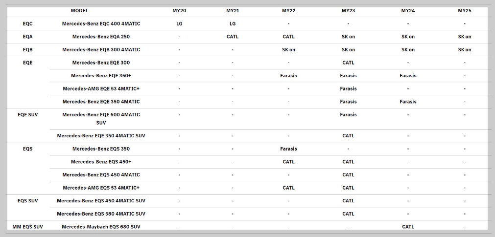 그 외에도 벤츠의 상위 모델인 EQS에서는 EQS 350 트림에 파라시스 배터리가 탑재되었으며, 다른 트림에는 CATL 배터리가 장착된 것으로 확인되었습니다. EQE SUV는 EQS 350에는 파라시스 배터리, EQE 350 4MATIC에는 CATL 배터리가 사용되고 있습니다. 반면, EQE보다 낮은 차급인 EQB는 SK온 배터리가, EQC는 LG에너지설루션 배터리가 탑재되며, EQA는 연식에 따라 CATL과 SK온 배터리가 달리 장착되는 것으로 나타났습니다. 이와 같은 배터리 제조사 배분에 대한 차이는 럭셔리 프리미엄 브랜드인 벤츠의 전략에 대한 소비자들의 관심을 더욱 높이고 있는 실정입니다.