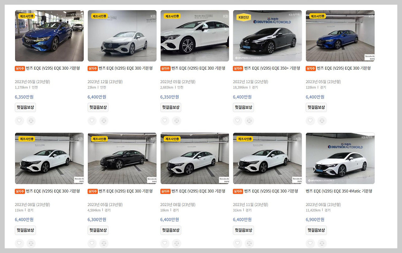 당연히 리세일 가치가 크게 하락했을 것으로 예상되는데요, 실제로 엔카나 KB 차차차 같은 중고차 플랫폼에서 벤츠 EQE를 검색해 본 결과, 주행거리가 불과 수십에서 수백 km에 불과하고 출고된 지 1년도 안 된 차량들이 6천만 원 초반대의 가격으로 다수 올라와 있는 것을 확인할 수 있었습니다. 특히, 브랜드 인증 차량들이 많은 것을 보면 시승차로 사용되었던 차량들이 급하게 처분되고 있는 매물이 아닌가 하는 추측도 들죠, 과연 이러한 매물들을 누가 살 수 있을까요?
