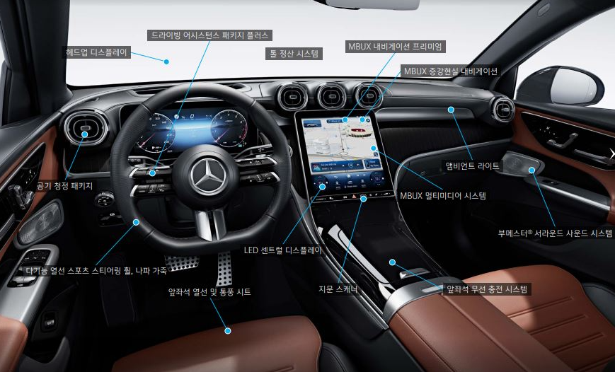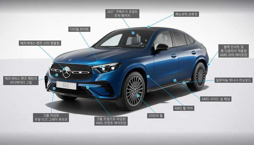 메르세데스-벤츠 GLC 쿠페의 상위 트림은 AMG 라인 외장 패키지가 적용되어 스포티함을 한층 더 강화한 것이 특징인데요, 이 패키지에는 메르세데스-벤츠 특유의 라디에이터 그릴, 날렵한 디자인의 에어 인테이크가 장착된 AMG 프런트 에이프런, 디퓨저 룩이 적용된 AMG 리어 에이프런, 그리고 AMG 사이드 실 패널 등이 포함됩니다. 또한, 20인치 AMG 멀티 스포크 경량 알로이 휠과 차량과 동일한 색상의 휠 아치 라이너가 더해져 깔끔하면서도 자신감 넘치는 외관을 완성했습니다. 이러한 요소들이 결합되어 벤츠 GLC 쿠페 상위 트림의 인기를 견인하고 있는 것이겠죠.