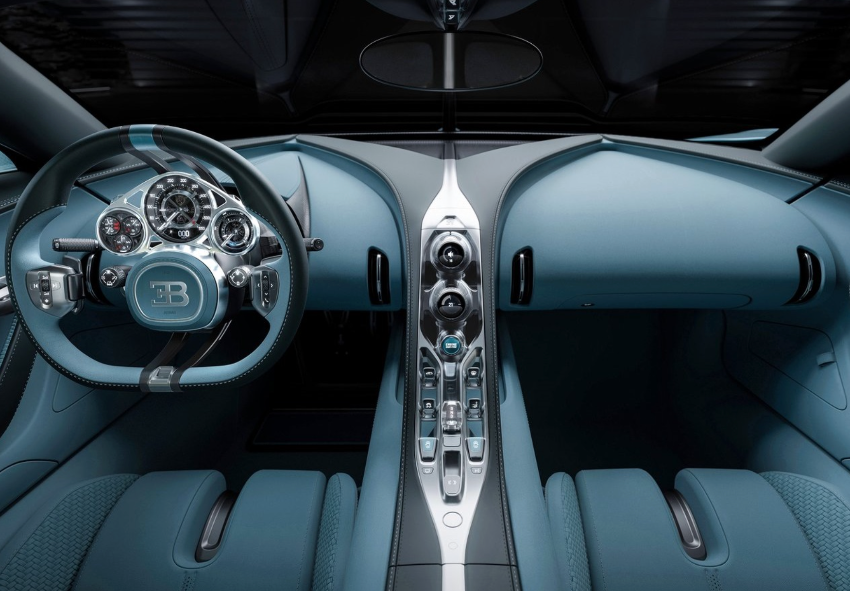 이번 모델의 다른 독특한 특징 중 하나는 스티어링 휠의 핸들 부분만이 회전하며, 휠 중앙에 위치한 부가티 로고는 고정된 상태입니다. 이는 롤스로이스의 휠캡과 유사한 기능을 제공하여 매우 독특한 디자인을 선보입니다.