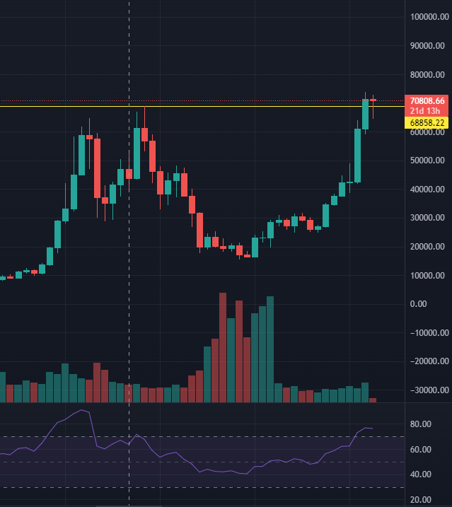비트코인이 반감기를 앞두고 1억을 돌파 한 이후 조정을 받고 있습니다. 건강한 조정인지 이번 비트코인 상승을 끝으로 하락장으로 이어질지는 계속해서 지켜보면서 대응을 해야 합니다. 비트코인은 4/9일 자 7만 달러는 재차 돌파하면서 조정 후 잠깐의 상승을 보여 주었지만 상승 이후에 나오는 조정과 상승을 거치는 모습을 보여주고 있습니다.