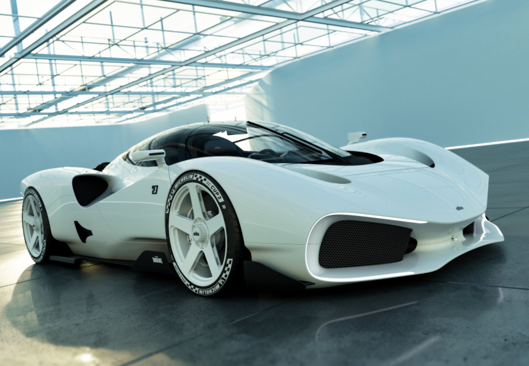 또한, CIMA의 7단 수동 변속기와 결합되어 순수한 주행 경험을 선사하며, 엔진은 세라믹 코팅된 알루미늄 합금 서브 프레임 내에 배치되어 성능과 디자인의 조화를 이룹니다. 닐루 하이퍼카는 더블 위시본 푸시로드 서스펜션을 채택하여 정밀하고 안정적인 핸들링을 제공합니다. 전륜에는 265/35 R20, 후륜에는 325/30 R21의 미쉐린 파일럿 스포츠 컵 2 R 타이어가 장착되어 있으며, 닐루27이 자체 설계한 초경량 센터락 휠이 결합되어 무게를 최소화했습니다.