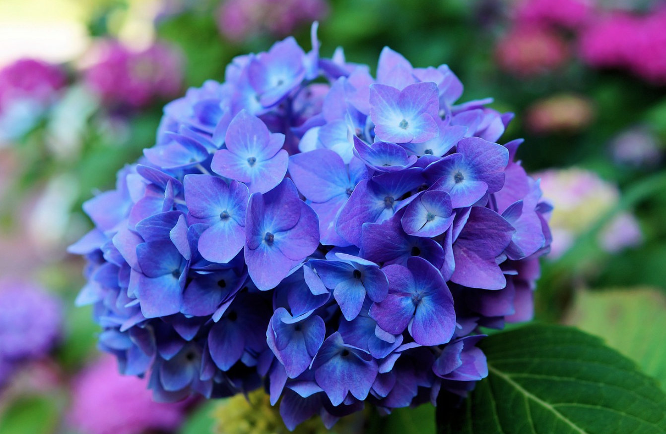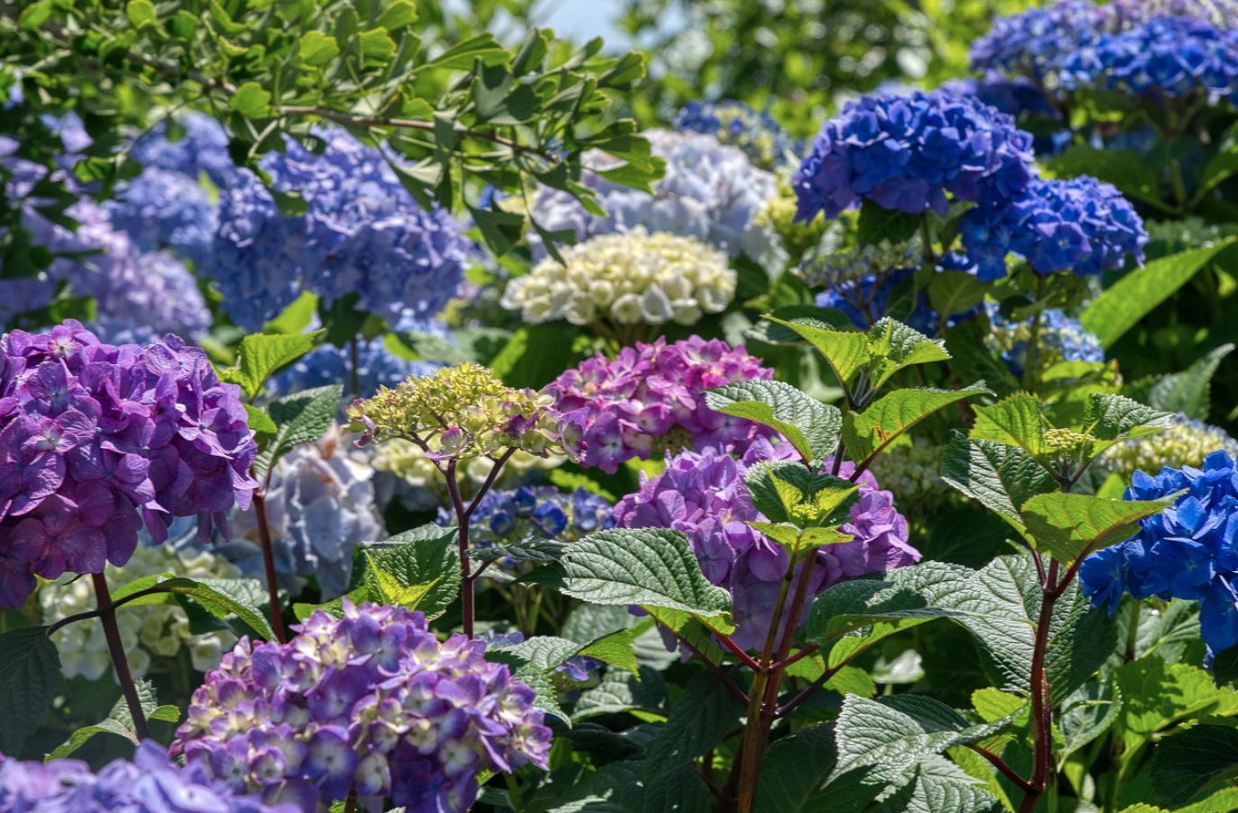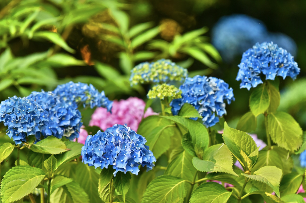 수국의 색상은 토양의 pH에 따라 변합니다. 예를 들어, 산성 토양에서는 파란색 꽃이, 중성에서 약간 알칼리성 토양에서는 분홍색 꽃이 핍니다.