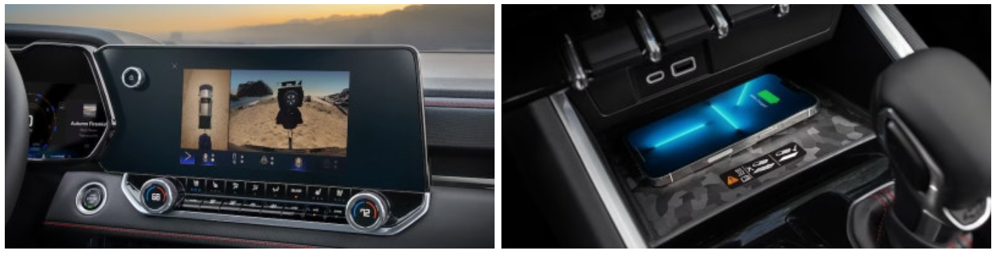 쉐보레 콜로라도 풀체인지의 실내에는 레버식 기어노브가 장착되어 있는데요, 휴대폰 무선 충전기능과 USB 포트가 센터패시아와 센터 콘솔 사이에 위치하며, 드라이브 모드 다이얼과 전자식 파킹 브레이크는 기어노브 옆에 자리 잡고 있습니다. 그리고 서라운드 뷰 기능도 선택할 수 있는 것으로 보입니다.