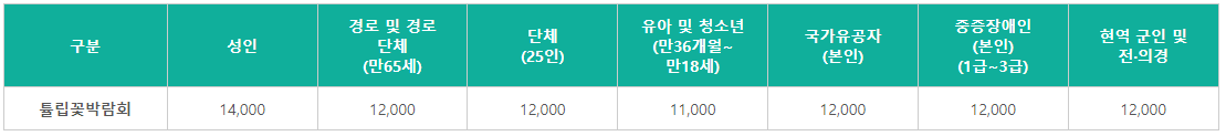 태안 세계튤립박람회의 이용요금은 일반 성인은 14,000원, 유아 및 청소년은 11,000원 기타 경로 및 국가유공자, 군인, 중증장애인의 경우는 12,000원입니다. 무료입장은 만 36개월 미만 유아이니 참고하시면 되겠습니다.