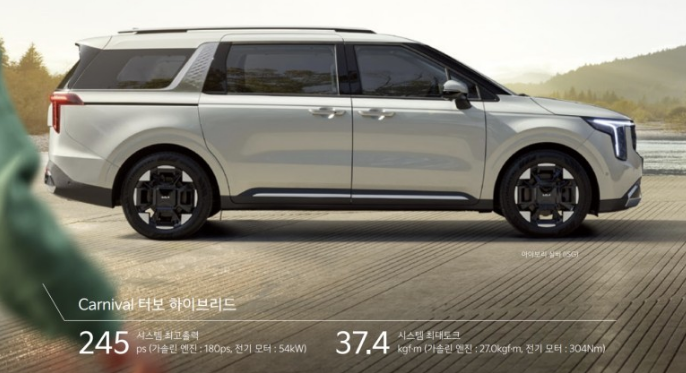 카니발 KA4 하이브리드 역시 1.6터보 하이브리드 엔진이 탑재되었으며, 가솔린 엔진 최고 출력 180 PS/5,500 rpm, 전기모터의 최고출력 54KW, 가솔린 엔진 최대 토크 27.0 kgf·m/1,500~4,500 rpm, 전기모터 최대토크 304Nm의 재원을 볼 수 있습니다. 카니발의 커진 차체를 보완하기 위해 기아에서 노력했다는 느낌을 받을 수 있지만 일부 카니발 고객들은 힘이 조금 부족하다는 말도 많이 있었습니다.