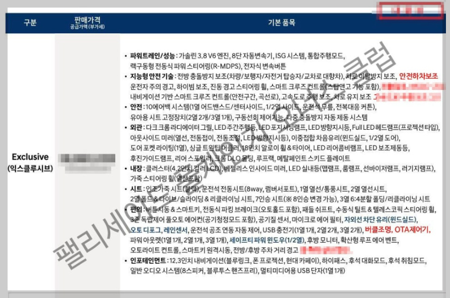 팰리세이드 풀체인지(LX3)의 출시를 기다리는 소비자들에게 흥미로운 소식이 한 가지 전해졌는데요, 기존 팰리세이드의 가장 낮은 트림인 익스클루시브 트림을 기준으로 한 신형 팰리세이드 익스클루시브 트림 사양이 일부 공개되었는데요, 새로운 옵션 사양이 추가된 것이 눈에 띕니다. 다만, 일부 추가적인 옵션 사양에 대한 정보는 가려져 있어, 향후 더 많은 세부 사항이 공개될 것으로 보입니다.