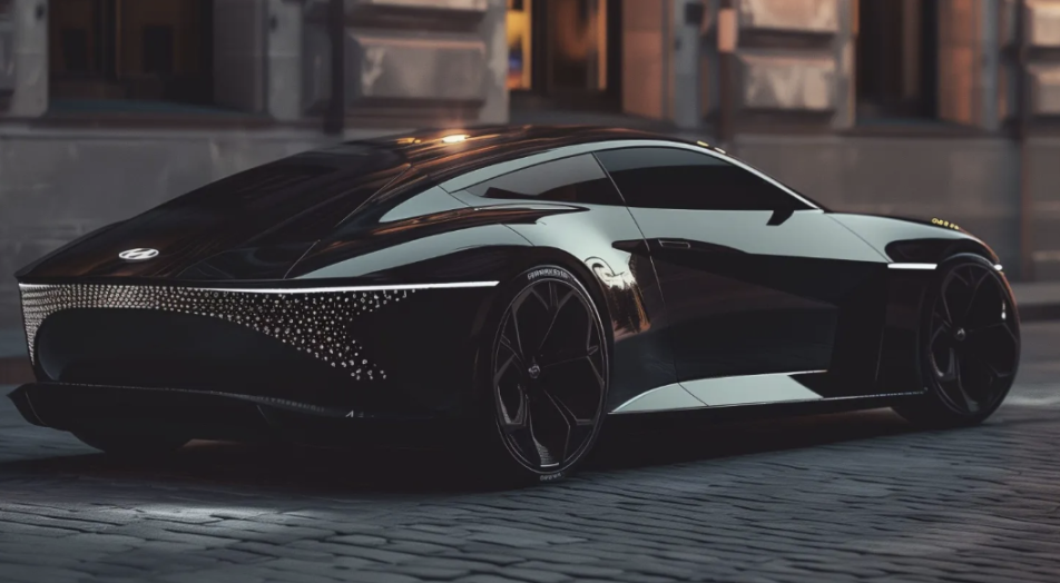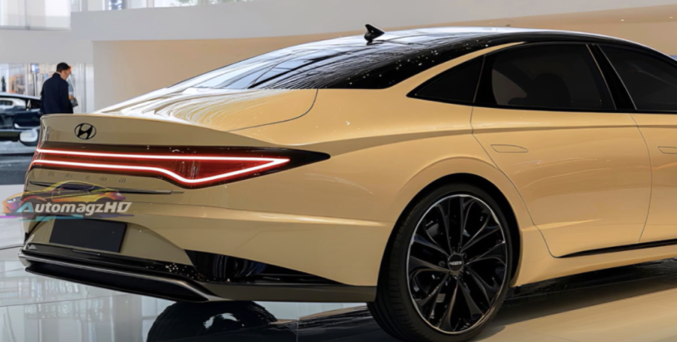측면 실루엣은 쿠페 스타일을 강조하며, 숨겨진 도어핸들과 사이드미러의 디지털 카메라 적용 가능성을 보여줍니다. 특히 고성능 모델을 연상시키는 블랙 휠과 볼륨감 있는 디자인은 이전 세대와 차별화된 역동성을 선사합니다. 후면부는 별 모양의 테일램프와 얇고 길게 뻗은 LED 라이트로 미래지향적 이미지를 극대화했으며, 조명이 들어간 현대 엠블럼이 트렁크 라인을 장식합니다.