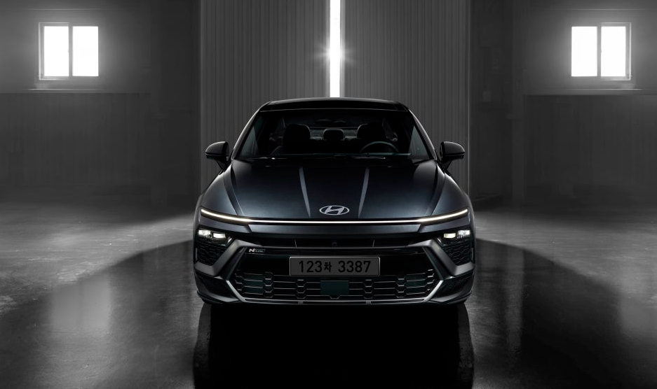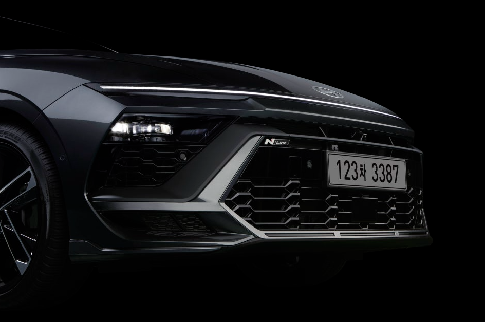 페이스리프트된 쏘나타 디 엣지 디자인을 좀 더 자세히 살펴보겠습니다. 이 모델은 N라인으로, 고성능을 강조한 스포티한 버전인데요, 이 모델의 넓은 블랙 메쉬 패턴 그릴은 일반 쏘나타보다 더 넓고 공격적인 형태로, 차량 전면부에 강렬한 인상을 부여하고 있죠. 또한, N라인 전용 범퍼는 공기역학적 성능을 개선하기 위해 하단에 대형 공기 흡입구가 추가되었습니다.