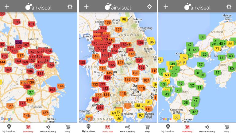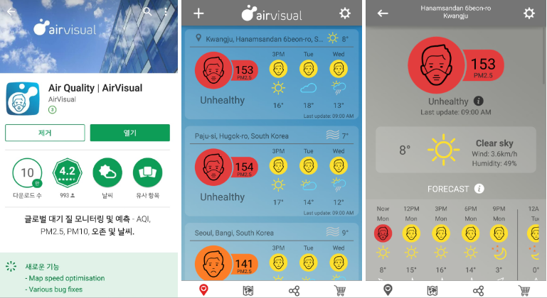 에어 비주얼(air visual)이라는 어플은 세상 모든 사람들을 공기의 질에 관한 문제에서 자유롭게 만들기 위해 시작된 클라우스 소싱 프로젝트 입니다. 어플 상의 언어는 모두 영어로 되어 있지만, 공기의 상태를 파악하는 데는 전혀 문제가 되지 않습니다. 어플에 나오는 그림만 보아도 이해할 수 있을 정도로 잘 나타나 있습니다.
