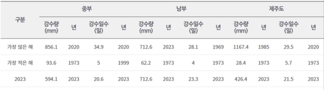 과거의 강수량 데이터를 보더라도 2020년이 가장 많은 비가 내린것을 알 수 있는데요, 그에 비해 1973년에는 강수일수가 5일밖에 되지 않아 얼마나 가뭄이 심했을지 가늠해 볼 수 있습니다. 2023년에도 서울이 잠긴 일들이 많았는데요, 2020년에는 그보다 훨씬 더 많은 856mm의 비가 내렸습니다. 올해는 대비를 철저히 해서 피해를 최소화할 수 있어야 하겠습니다.