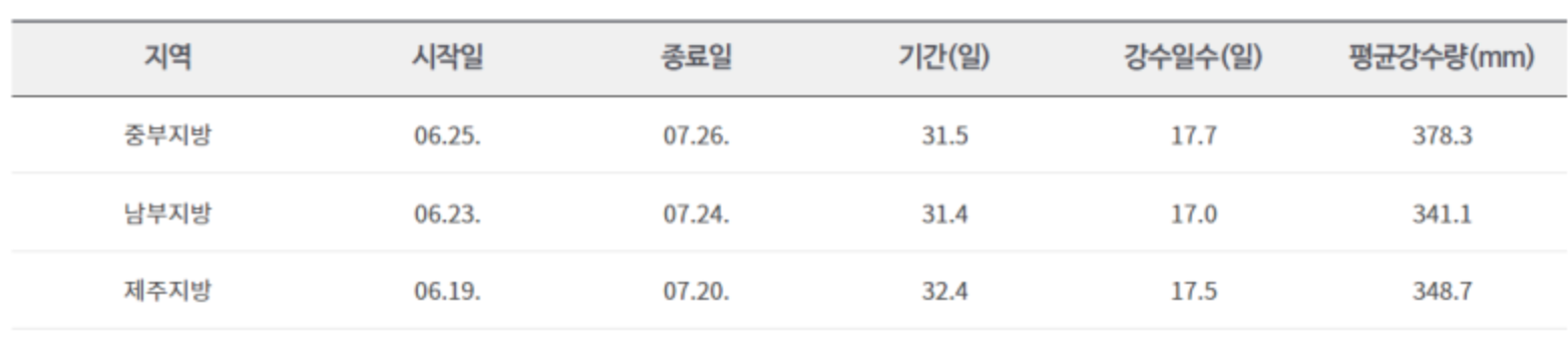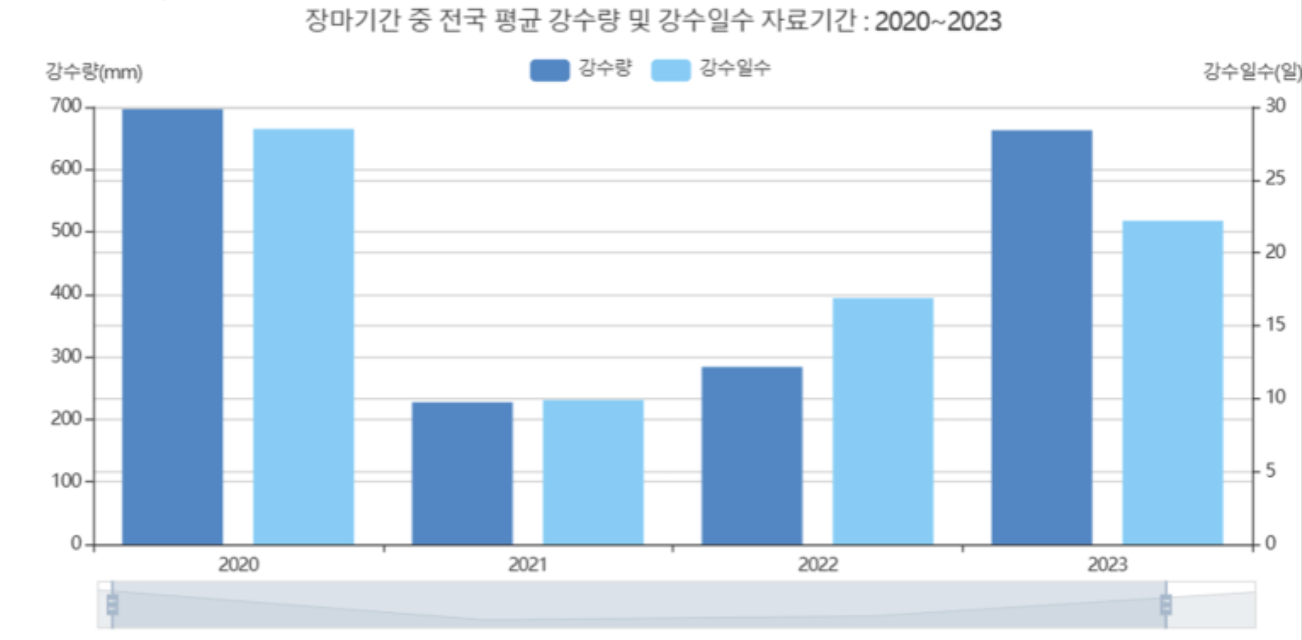우리나라의 장마 기간은 보통 6월 말부터 7월 초에 시작되어 8월 말에서 9월 초에 가을 장마로 이어지는데요, 장마 기간은 매년 변동이 있기 때문에, 지난 몇 년간의 평균 통계를 기준으로 예측합니다. 기상청 홈페이지에서는 년도별로 장마 기간과 강수량을 확인할 수 있으며, 2020년부터 2023년까지의 장마철 기간과 강수량 통계를 산출해 보았습니다. 이 통계를 통해 올해 장마철 대비에 참고할 수 있습니다.