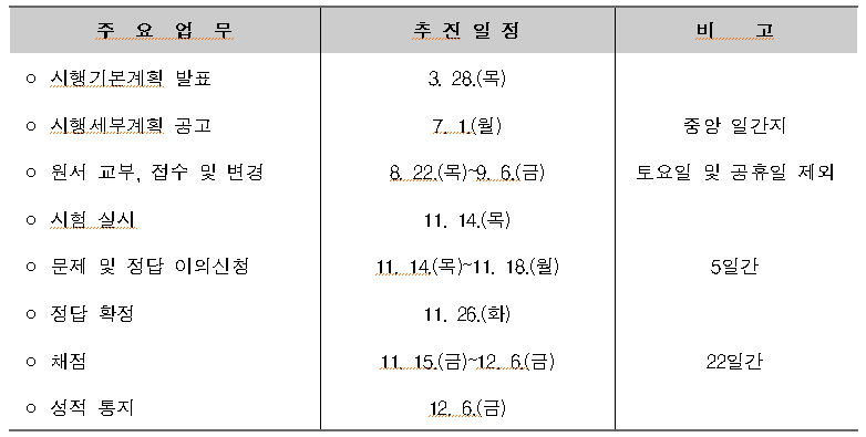 시행기본계획을 발표하여 주요 업무에 관한 일정이 나와 있습니다. 해당 표를 참고하시어 2025학년도 수능 시험에 큰 도움이 되셨으면 좋겠습니다.