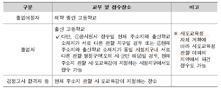 수능시험 응시원서 교부 및 접수 등의 운영기간은 2024 8월 22일(목) ~ 2024 9월 3일(화)로 예정되어 있습니다. 재학생은 재학중인 고등학교에서 원서 교부 및 접수를 하면되고, 졸업자는 출신 고등학교에서 원서교부 및 접수를 하면 됩니다. 다만 졸업자의 경우는 현재 주소지와 출신학교 소재지가 다를 경우 현재 주소지 관할 시·도교육감이 지정하는 시험지구에서 접수가 가능합니다.