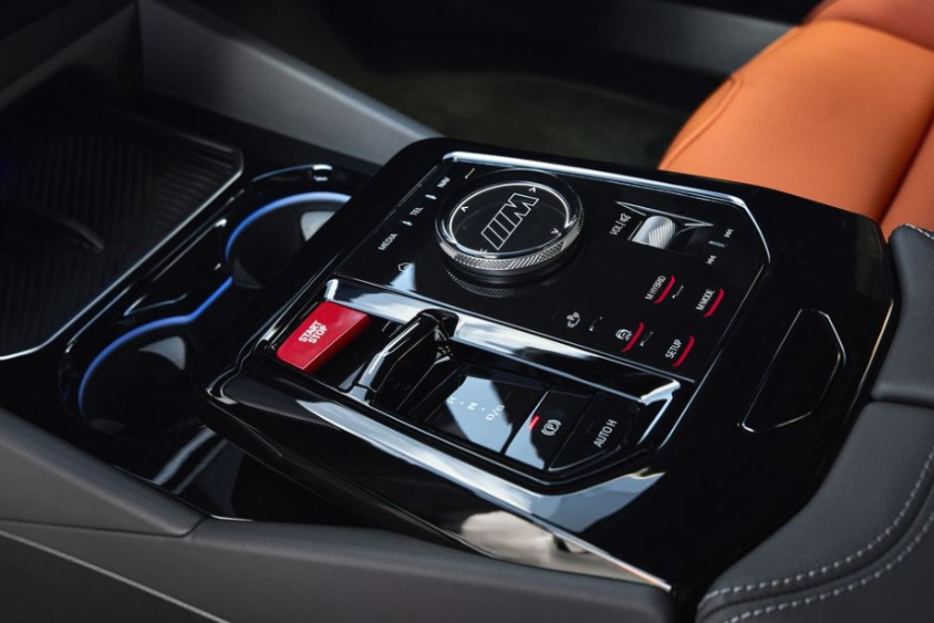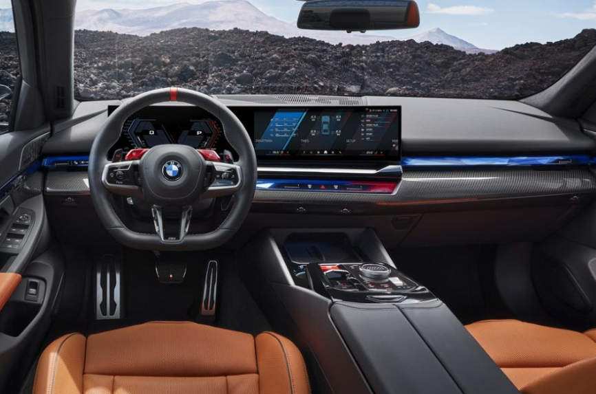 내부는 일반적인 5시리즈와 유사하지만, 2025 BMW M5에서는 탄소 섬유 소재가 훨씬 더 많이 사용되었습니다. 바닥은 평평하며, 새로운 3-스포크 M 가죽 스티어링 휠이 12시 방향에 빨간색 센터 마커와 함께 장착되었습니다. 프로그래밍 가능한 M 버튼은 휠 뒤에 있는 패들 시프터와 함께 약간 수정된 디자인으로 구현되었습니다. 센터 콘솔의 컨트롤 패널에는 DSC 설정을 변경할 수 있는 영구 버튼이 포함되어 있으며, 이는 다른 최신 M 시리즈 차량과 동일한 기능을 제공합니다.