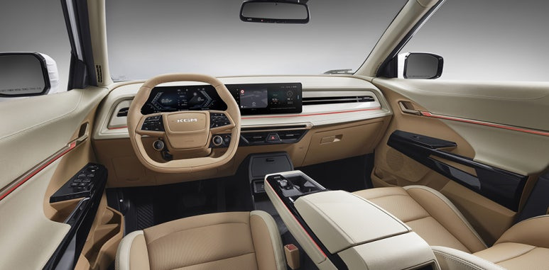 또한, 두 개의 스포크로 구성된 더블 D컷 스타일의 스티어링 휠에는 새로운 물리 버튼이 추가되어 편의성을 높였는데요, 중앙에는 KGM 엠블럼이 새겨져 브랜드 아이덴티티를 강조하고 있죠, 실내 디자인에서는 퀼팅 패턴이 적용된 스웨이드 콤비 시트와 천연 가죽 시트, 스웨이드 도어 센터 트림이 사용되었으며, 로즈 골드 색상의 몰딩 라인, 트윌 카본 패턴 가니쉬, 블랙 우드 패턴 가니쉬가 소재와 패턴의 차별화를 보여줍니다. 또한, 크리스털 소재의 토글 타입 전자식 변속 레버가 고급스러움을 더하고 있습니다.