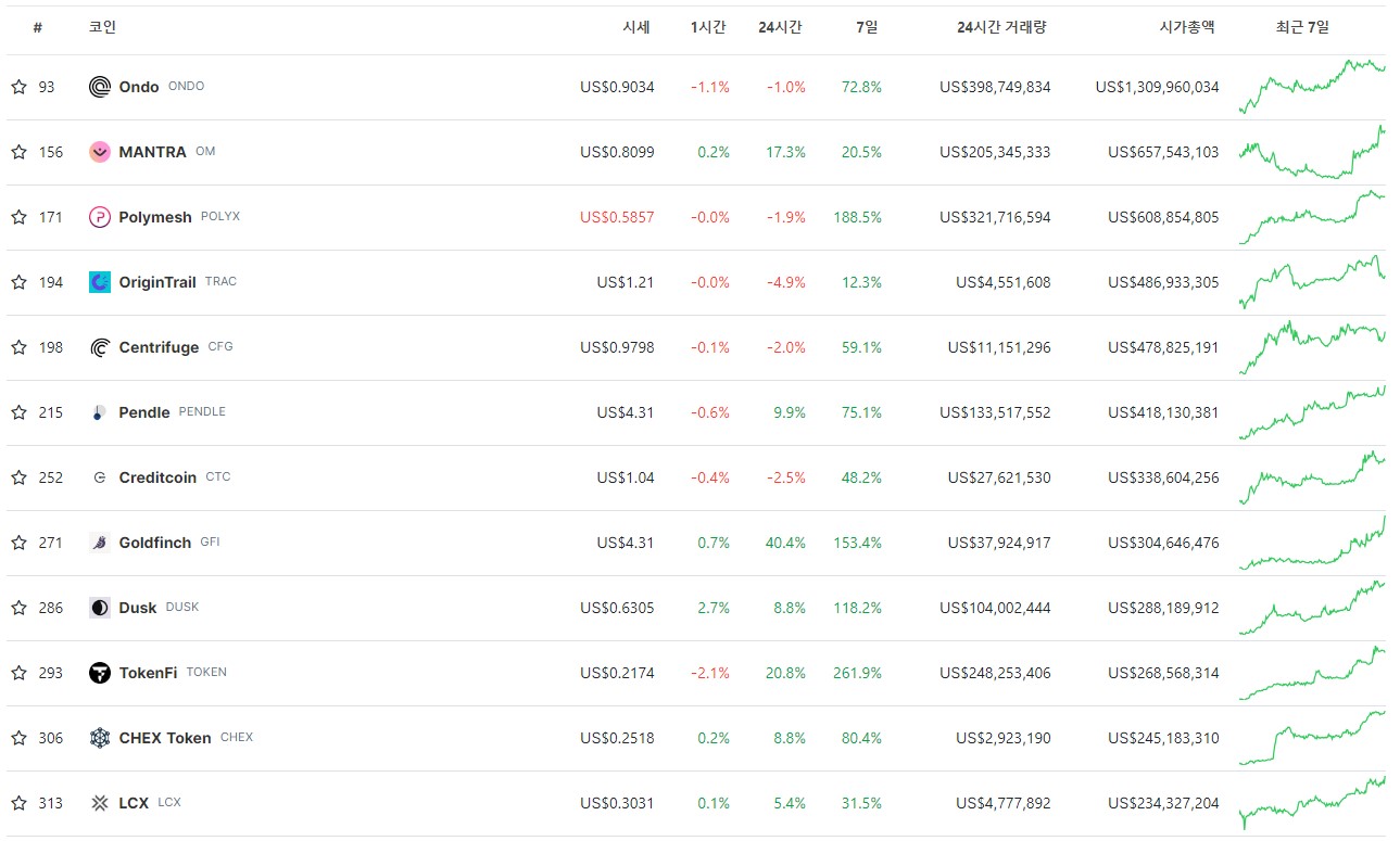 RWA 코인 시장은 다양한 프로젝트로 구성되어 있는데, 그중에서도 특히 주목받고 있는 몇 가지 코인들이 있습니다. 한국의 업비트에 상장되어 있는 체인링크(LINK)는 오라클 데이터를 제공하는 플랫폼으로서, 블록체인 외부의 데이터를 내부로 가져오는 중요한 역할을 하며, 실물자산의 정보를 블록체인 상에 연결할 수 있는 기술을 제공하고 있습니다. 또한 스텔라루멘(XLM)은 프랭클린템플턴과 같은 유명 금융 회사의 미국 국채 토근과 관련된 RWA 코인으로 분류할 수 있으며 최근 소로반 업데이트를 통해 이목을 받은 바 있습니다. 온도 파이낸스(ONDO)는 미국 채권과 연동된 상품을 기반으로 하는 프로젝트로, 최근 빠른 성장속도를 보여주고 있습니다.